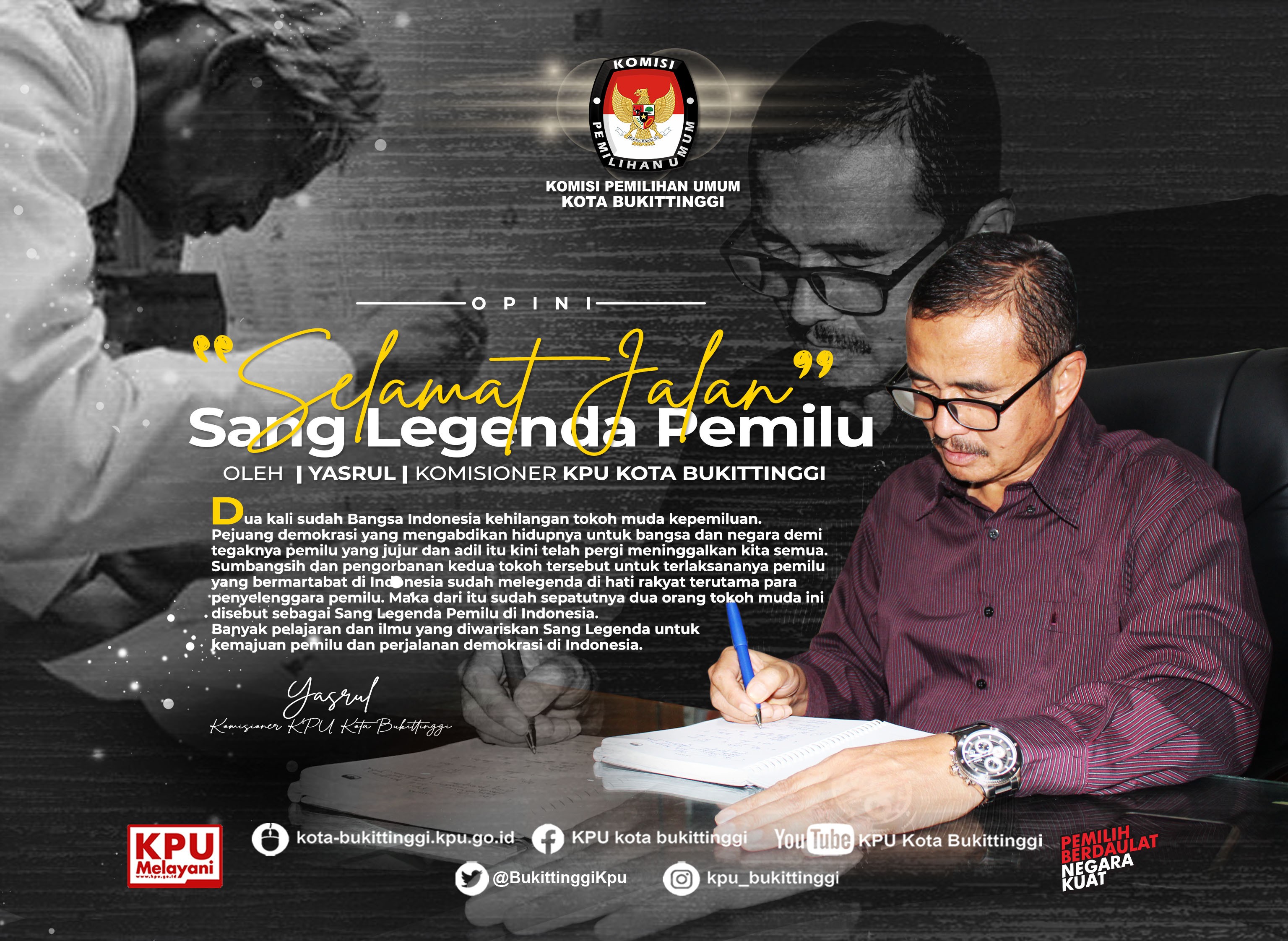 Kini Sang Legenda sudah pergi untuk selamanya, namun ilmu-ilmu yang diwariskan serta ide-ide yang sudah dicetuskan tentang pemilu dan demokrasi akan selalu bermanfaat bagi banyak orang. Selamat jalan sang legenda pemilu, selamat jalan pejuang demokrasi, karya dan ide-ide cemerlangmu akan selalu menghiasi perjalanan panjang pemilu di Indonesia. YASRUL | Komisioner KPU Kota Bukittinggi