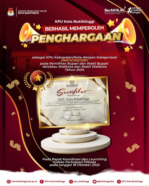 Bukittinggi, KPU Kota Bukittinggi menunjukkan kembali kinerja yang optimalnya dalam meningkatkan partisipasi pemilih. Kali ini KPU Kota Bukittinggi meraih penghargaan sebagai KPU Kabupaten/Kota dengan Kategori Participatory (Komitmen Penuh) pada Pemilihan Wali Kota dan Wakil Wali Kota Bukittinggi Tahun 2024 lalu. Penghargaan ini diterima oleh KPU Provinsi Sumatera Barat pada Peluncuran Indeks Partisipasi Pilkada pada tanggal 18 Oktober 2025 di Jakarta. KPU Kota Bukittinggi termasuk 24 Kabupaten/Kota (4,7%) yang termasuk kategori Paticipatory (Komitmen Penuh) yang nilai skornya lebih besar dari 77,5. Terdapat faktor-faktor yang secara determinan menggenerate partisipasi antara lain registrasi pemilih, pencalonan, kampanye, sosialisasi pendidikan pemilih dan partisipasi masyarakat dan (Voter Turnout) Kehadiran Pemilih di TPS. Penyusunan indeks partisipasi pilkada dimulai sejak Bulan April tahun 2025, KPU Kota Bukittinggi menorehkan skor pada masing-masing kategori sebagai berikut registrasi pemilih dengan skor 70,60 ; pencalonan dengan skor 73,00 ; Kampanye dengan skor 82,00 ; Sosialisasi Pendidikan Pemilih dan Partisipasi Masyarakat dengan skor 79,00 dan kehadiran pemilih dengan skor 83,40 ; dan skor akhir indeks sama dengan 78,64. Dari data kategori tersebut KPU Kota Bukittinggi memperoleh skor tertinggi pada kategori Sosdiklih Parmas antar Kabupaten/Kota se-Sumbar Indeks Partisipasi Pilkada merupakan alat ukur empiris untuk melihat pergeseran dari konsepsi demokrasi elektoral yakni berfokus pemungutan suara menuju demokrasi partisipatoris yang menunjukkan keterlibatan warga negara diseluruh siklus pemilu secara esensial sekaligus mengafirmasi teori electoral governance dimana pengelolaan pemilu bukan lagi domain eksklusif negara melainkan arena multi faktor antara peserta pemilu, pemilih, media dan masyarakat sipil. Penyusunan Indeks Partisipasi Pemilih yang dilakukan oleh KPU RI bekerja sama dengan organisasi masyarakat kepemiluan dan akademisi. Selanjutnya dilakukan diskusi panel, menghadirkan narasumber Drs. Bakhtiar, Dirjen Politik dan Pemerintahan Umum Kemendagri, Totok Haryono, anggota Bawaslu, Nudjula Anggeraini Kementerian PPN/Bappenas, August Mellaz, Anggota KPU, Mada Sukmajati sebagai Ketua Tim Indeks Partisipasi Pilkada yang dipandu oleh Moderator, Annisa Dasuki. Ketua KPU dalam sambutannya menyatakan bahwa Indonesia memiliki tantangan yang unik dalam penyelenggaraan Pilkada 2024 dimana pertama kalinya dilakukan pada tahun yang sama dengan Pemilu 2024. Oleh karena itu Indeks Partisipasi Pilkada merupakan sebuah bukti kerja nyata KPU dalam menyelenggarakan Pilkada Tahun 2024. Dari angka menjadi makna serta bisa merefleksikan kinerja kepada publik untuk perbaikan pemilu dan pilkada yang akan datang. Penghargaan yang diperoleh KPU Kota Bukittinggi tidak terlepas dari kerja sama pemangku kepentingan yang ada di Bukittinggi. Mulai dari pemerintah Kota Bukittinggi beserta organisasi perangkat daerahnya, Polresta Bukittinggi dan Kodim 0304/Agam, Koordinator Badan Intelijen Negara Wilayah Bukittinggi, PPK, PPS, KPPS se-Kota Bukittinggi yang turut berpartisipasi mensukseskan Pilkada Tahun 2024, media online dan konvensional, pasangan calon wali kota dan wakil wali kota Bukittinggi, partai politik tingkat Kota Bukittinggi, organisasi masyarakat, pemilih se-Kota Bukittinggi dan seluruh jajaran KPU Kota Bukittinggi khususnya Divisi Sosialisasi Pendidikan Pemilih Partisipasi Masyarakat dan SDM @muhammad_fauzan_harza , Sub Bagian Partisipasi Hubungan Masyarakat dan SDM @aldho.syafriandre, @winigusnita, @dewi_m.sulaiman, dan @nurulanisa528 ....