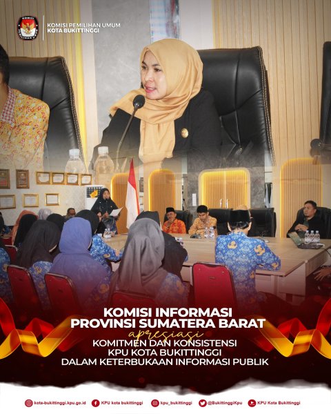 Bukittinggi, Komisi Pemilihan Umum Kota Bukittinggi menerima kunjungan Tim Visitasi Komisi Informasi Provinsi Sumatera Barat dalam rangka verifikasi faktual pada pelaksanaan monitoring dan evaluasi (monev) Keterbukaan Informasi Publik Tahun 2025 pada hari Selasa, 28 Oktober 2025. Kunjungan ini merupakan tahapan akhir dari proses penilaian keterbukaan informasi publik yang dilakukan oleh Komisi Informasi terhadap seluruh badan publik di Sumatera Barat. Dalam sambutannya Ketua Tim Visitasi Komisi Informasi Provinsi Sumatera Barat, Mona Sisca menyampaikan bahwa "kami mengapresiasi KPU Kota Bukittinggi dalam komitmen dan konsistensi dalam pelayanan keterbukaan informasi publik. KPU Kota Bukittinggi tidak mengalami gangguan dalam pelayanan informasi publik walaupun ada perubahan dalam struktur PPIDnya". Kegiatan visitasi ini merupakan tahapan terakhir dari rangkaian monev 2025 setelah melalui proses panjang diantaranya pendaftaran akun aplikasi monev 2025, pengisian kuesioner, masa sanggah, presentasi dan penilaian dokumen. Kali ini visitasi dilakukan untuk memverifikasi secara langsung implementasi keterbukaan informasi publik di lapangan. KPU Kota Bukittinggi menjadi salah satu badan publik yang berhasil masuk nominasi tiga besar disetiap kategori penilaian Monev Tahun 2025. Hal ini menunjukan bahwa KPU Kota Bukittinggi dinilai memiliki sistem keterbukaan informasi publik yang sangat baik mulai dari website, layanan informasi PPID hingga inovasi dalam penyampaian informasi kepada masyarakat Ketua KPU Kota Bukittinggi, Satria Putra dalam sambutannya menyampaikan terima kasih atas kehadiran tim visitasi “kami di KPU Kota Bukittinggi terus berupaya menjaga komitmen terhadap keterbukaan informasi publik serta KPU Kota Bukittinggi dapat terus meningkatkan kualitas layanan informasi dan menjadi badan publik yang inspiratif serta menjadi contoh bagi badan publik di Kota Bukittinggi. Dengan capaian masuk sebagai tiga besar badan publik terbaik di Sumatera Barat. KPU Kota Bukittinggi menunjukkan konsistensinya dalam prinsip keterbukaan informasi publik secara inovatif dan berkelanjutan. Sebelumnya KPU Kota Bukittinggi selalu berada dalam posisi tiga besar dalam empat kali berturut-turut dalam pelaksanaan monitoring keterbukaan informasi publik dan badan publik informatif yang diadakan oleh Komisi Informasi Provinsi Sumatera Barat. KPU Kota Bukittinggi menargetkan juara 1 dalam monev keterbukaan informasi pada tahun 2025 ini. (AS) ....