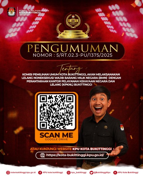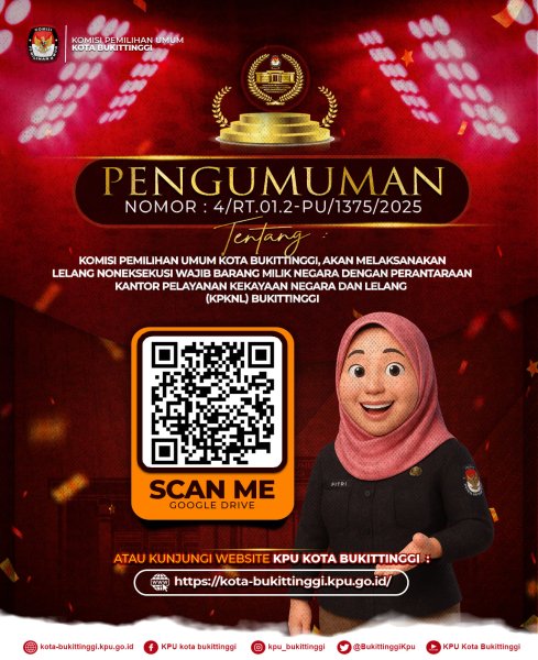 #TemanPemilih, KPU Kota Bukittinggi akan melaksanakan lelang non eksekusi wajib BMN berupa kendaraan operasional dengan perantara KPKNL Bukittinggi Yuk simak informasi selengkapnya pada QR Code diatas , atau pada website KPU Kota Bukittinggi atau membaca pengumuman di kantor KPU Kota Bukittinggi. DOWNLOAD DISINI !!! #KPUMelayani #KPUKotaBukittinggi ....