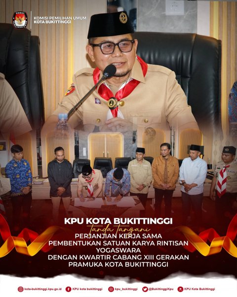 Bukittinggi, Komisi Pemilihan Umum Kota Bukittinggi melaksanakan penandatanganan Perjanjian Kerja Sama (PKS) dengan Kwartir Cabang XIII Gerakan Pramuka Kota Bukittinggi tentang Pembentukan Satuan Karya (Saka) Pramuka Rintisan Yogaswara di Lingkungan KPU Kota Bukittinggi. Kegiatan tersebut berlangsung pada Rabu, 17 Desember 2025, bertempat di Aula Kantor KPU Kota Bukittinggi. Penandatanganan PKS dilakukan oleh Ketua KPU Kota Bukittinggi, Satria Putra, dan Ketua Kwartir Cabang XIII Kota Bukittinggi, Ibnu Asis. Kegiatan ini turut dihadiri oleh Ketua KPU Provinsi Sumatera Barat, Amnasmen, pengurus Kwartir Cabang, anggota KPU Kota Bukittinggi, sekretaris, para kepala subbagian, serta staf sekretariat KPU Kota Bukittinggi. Dalam kesempatan tersebut, KPU Kota Bukittinggi juga menyerahkan cendera mata sebagai simbol sinergi dan komitmen kerja sama antar lembaga. Ketua KPU Kota Bukittinggi, Satria Putra, dalam sambutannya menyampaikan bahwa kerja sama ini bertujuan untuk meningkatkan partisipasi pemilih serta memperkuat hubungan antar lembaga dalam mendukung penyelenggaraan pemilihan dan pemilu di Kota Bukittinggi. Menurutnya, Gerakan Pramuka merupakan organisasi yang kuat dan memiliki jaringan luas hingga ke masyarakat, sehingga sangat strategis untuk dilibatkan dalam pendidikan pemilih. “Melalui kerja sama ini, kami berharap partisipasi pemilih di Kota Bukittinggi dapat terus meningkat. Pramuka adalah organisasi yang solid dan dekat dengan masyarakat, sehingga dapat menjadi mitra strategis KPU,” ujarnya. Sementara itu, Ketua Kwartir Cabang XIII Kota Bukittinggi, Ibnu Asis, dalam sambutannya menyampaikan apresiasi atas inisiatif KPU Kota Bukittinggi. Atas nama Pemerintah Daerah, ia mengucapkan selamat kepada KPU Kota Bukittinggi yang telah menginisiasi pembentukan Saka Pramuka Rintisan Yogaswara. “Ini merupakan langkah yang sangat luar biasa dan patut diapresiasi. Bahkan, ini menjadi yang pertama di Indonesia dan dapat menjadi role model bagi daerah lain,” ungkapnya. Ketua KPU Provinsi Sumatera Barat, Surya Efitrimen, juga menyampaikan bahwa kerja sama yang dilaksanakan ini merupakan tindak lanjut dari kerja sama antara KPU Provinsi Sumatera Barat dengan Kwartir Daerah Gerakan Pramuka Sumatera Barat. Ia menegaskan bahwa Pramuka merupakan organisasi yang selalu berinteraksi langsung dengan masyarakat. “Dengan adanya kerja sama ini, kami berharap Pramuka dapat membantu KPU dalam menyosialisasikan pemilihan dan pemilu, baik pada saat tahapan maupun di luar tahapan,” tuturnya. Melalui penandatanganan PKS ini, KPU Kota Bukittinggi dan Kwartir Cabang XIII Gerakan Pramuka Kota Bukittinggi berkomitmen untuk bersinergi dalam meningkatkan pendidikan pemilih dan partisipasi masyarakat demi terwujudnya demokrasi yang berkualitas di Kota Bukittinggi. ....