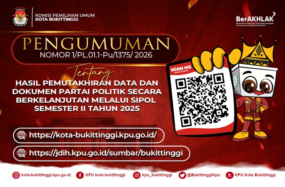 #TemanPemilih, Berikut PENGUMUMAN HASIL PEMUTAKHIRAN DATA DAN DOKUMEN PARTAI POLITIK SECARA BERKELANJUTAN MELALUI SIPOL SEMESTER II TAHUN 2025 Kota Bukittinggi #KPUMelayani #KPUKotaBukittinggi DOWNLOAD PENGUMUMAN DISINI !!! ....