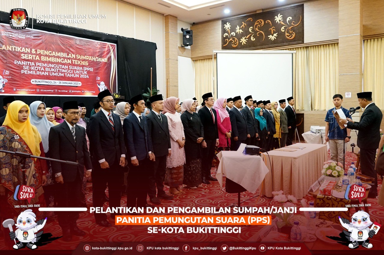 Pelantikan dan pengambilan sumpah/janji PPS se Kota Bukittinggi dilaksanakankan di Grand Royal Denai Bukittinggi Selasa (24/1). Pelantikan ini diawali dengan pengambilan sumpah yang dibacakan oleh Ketua KPU Kota Buittinggi dan diikuti oleh anggota PPS. Kemudian dilanjutkan dengan pelantikan dan pembacaan pakta integritas.
