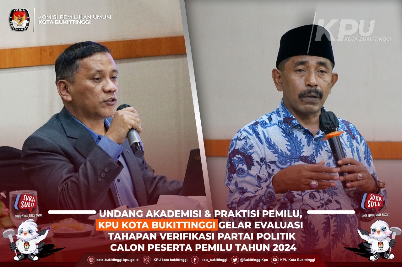 Dalam kegiatan evaluasi tahapan verifikasi partai politik calon peserta pemilu Tahun 2024 ini KPU Kota Bukittinggi mengundang narasumber dari akademisi pemerhati pemilu Dr. Aidinil Zetra, MA dari Ilmu Politik FISIP Unand. Dalam pemaparannya koordinator Magister Tata Kelola Pemilu Universitas Andalas, ini menyampaikan rekomendasinya antara lain penyelenggara pemilu hendaknya bersikap non partisan dan tidak memihak pada peserta manapun, hendaknya penyelenggara pemilu bersikap profesional dalam melakukan verifikasi agar tidak mudah dipengaruhi dalam mengambil keputusan dan penggunaan SIPOL hendaknya jangan mengenyampingkan berkas-berkas manual dalam verifikasi partai politik.