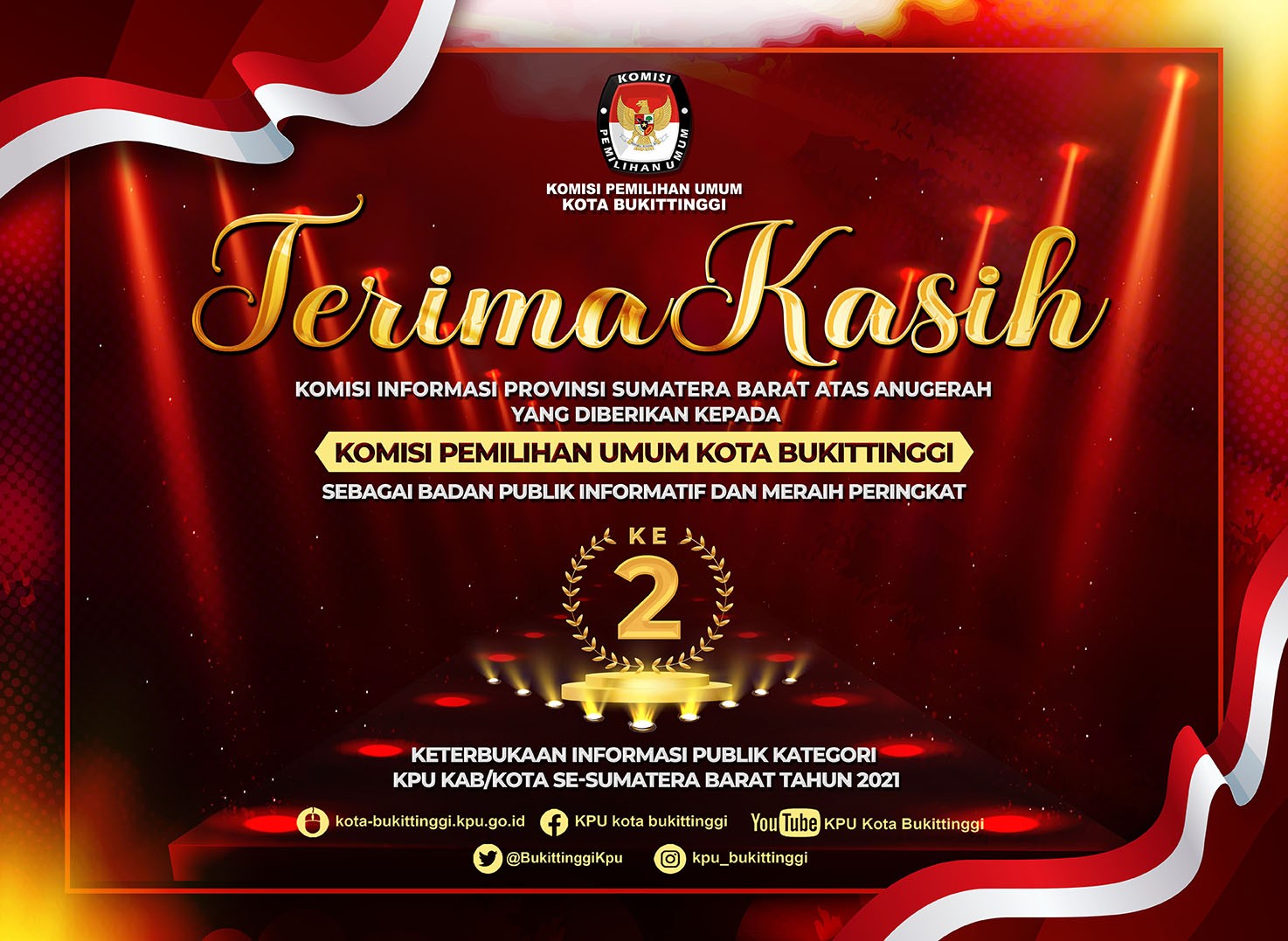 Terima Kasih kepada Komisi Informasi Sumatera Barat atas anugerah yang diberikan kepada KPU Kota Bukittinggi sebagai Badan Publik informatif dan meraih peringkat ke 2 Keterbukaan Informasi Publik Tahun 2021 Kategori KPU Kabupaten/ Kota se-Sumatera Barat dari Komisi Informasi Provinsi Sumatera Barat Senin, 6 Desember 2021.