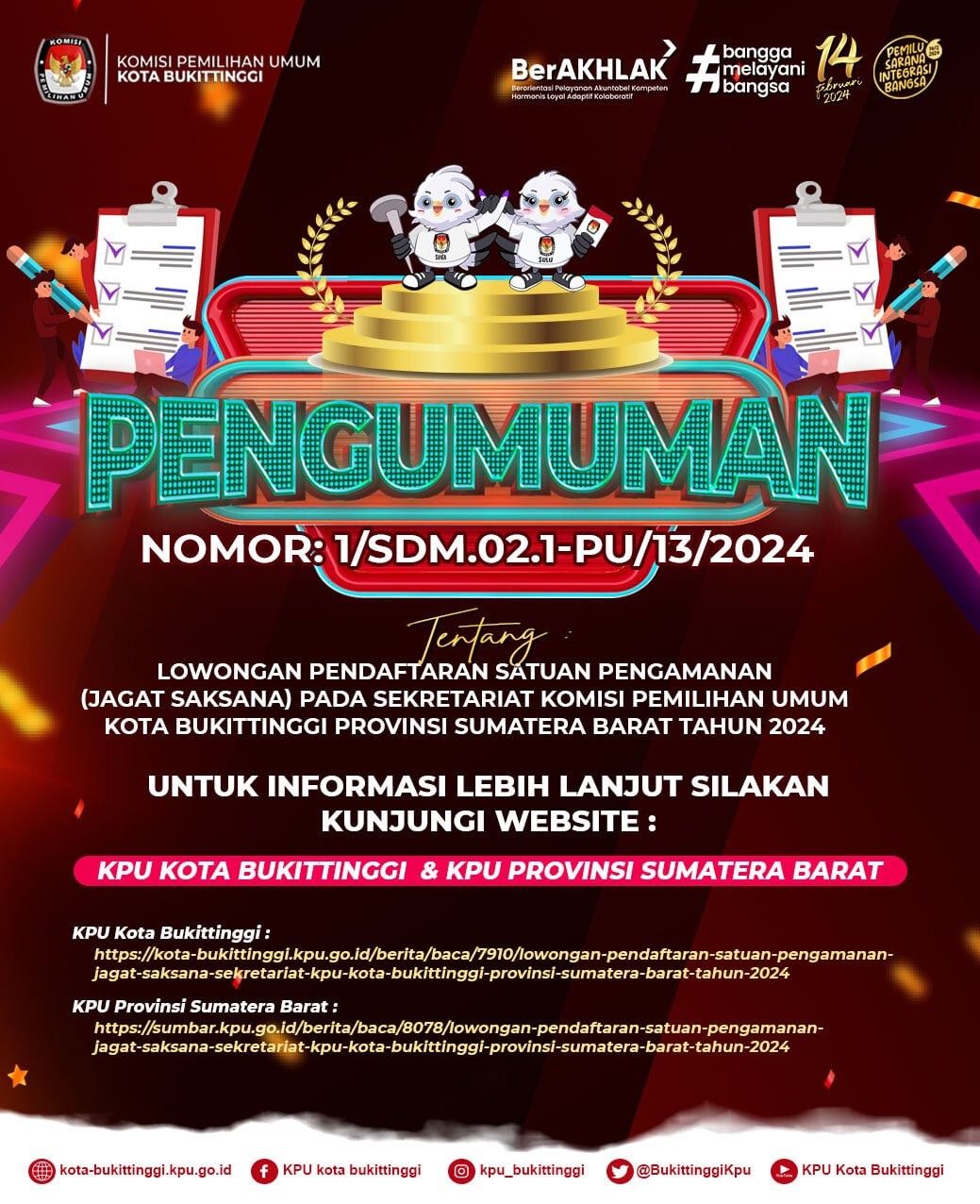 Lowongan Pendaftaran Satuan Pengamanan (Jagat Saksana) Sekretariat KPU Kota Bukittinggi Provinsi Sumatera Barat Tahun 2024