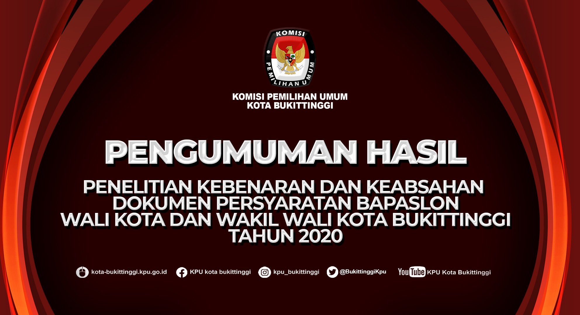 Pengumuman Hasil Penelitian Kebenaran dan Keabsahan Dokumen Persyaratan Bapaslon Wali Kota dan Wakil Wali Kota Bukittinggi Tahun 2020
