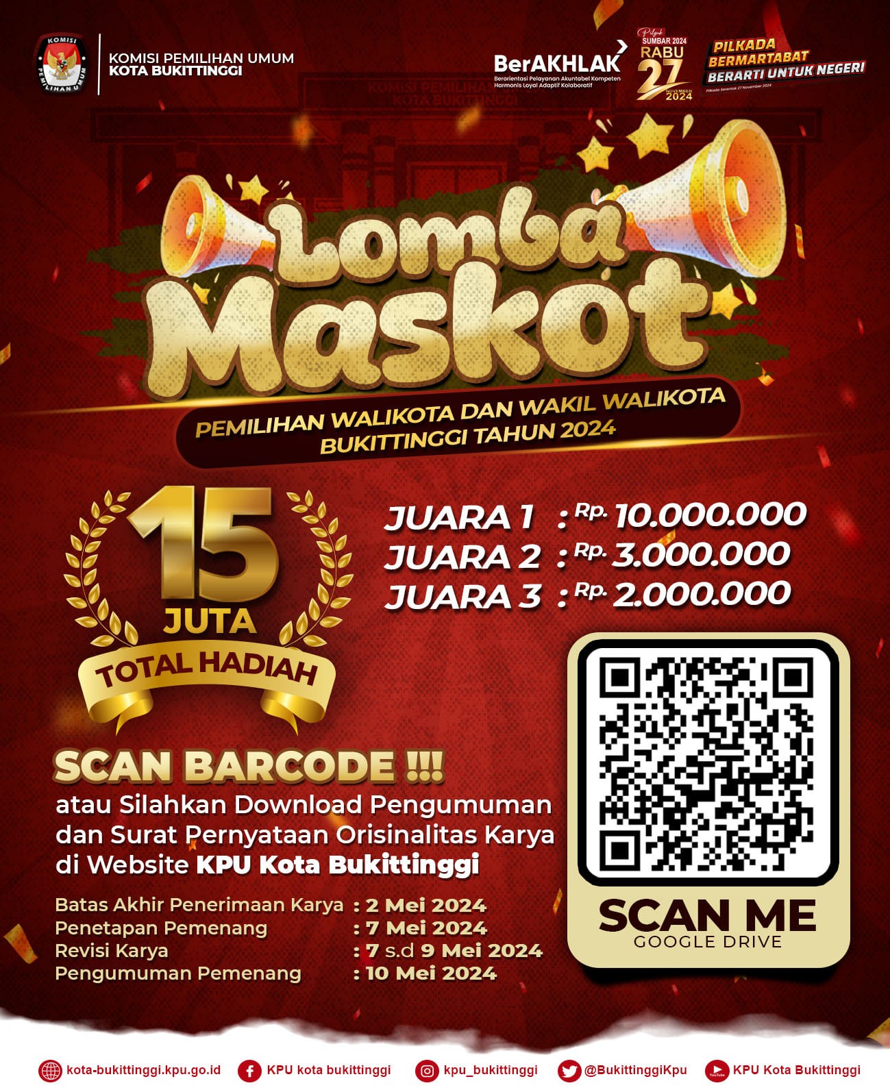 PENGUMUMAN LOMBA MASKOT KPU KOTA BUKITTINGGI Kamis, 25 April 2024 14:02 796 DOWNLOAD PENGUMUMAN DAN SURAT PERNYATAAN PENDAFTARAN PESERTA LOMBA Bagikan: Dilihat 796 Kali.