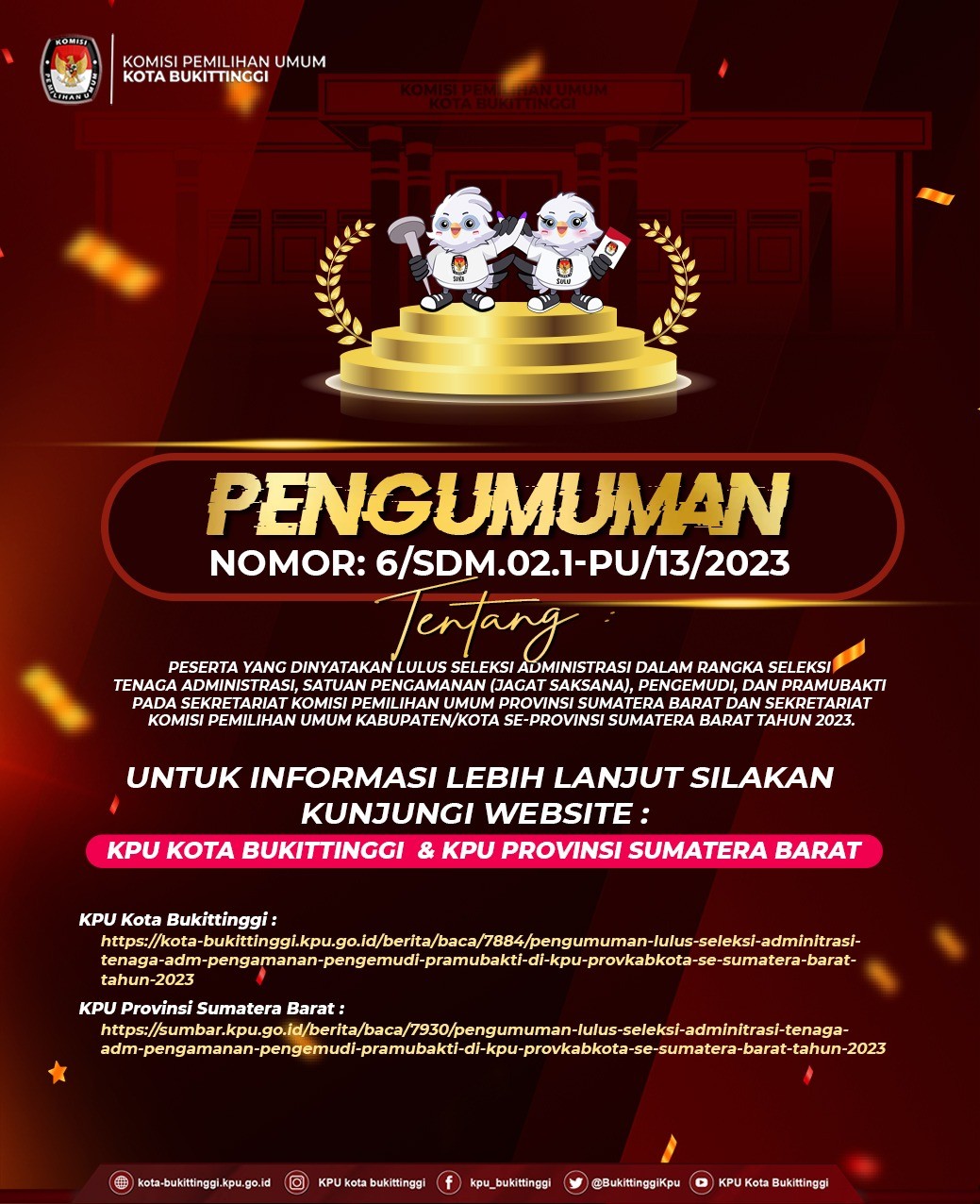 PENGUMUMAN LULUS SELEKSI ADMINITRASI TENAGA ADM, PENGAMANAN, PENGEMUDI, & PRAMUBAKTI DI KPU PROV/KAB/KOTA SE-SUMATERA BARAT TAHUN 2023