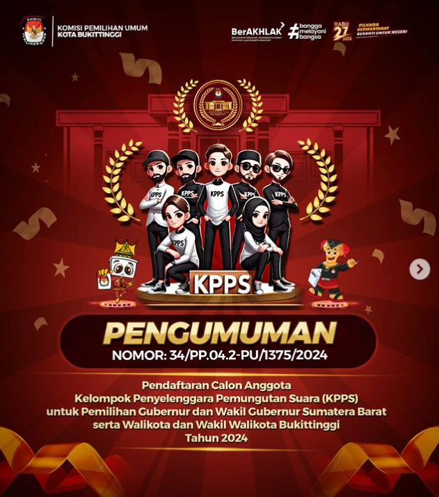 Pengumuman pendaftaran KPPS untuk Pemilihan Gubernur dan Wakil Gubernur Sumatera Barat serta Walikota dan Wakil Walikota Bukittinggi Tahun 2024 Selasa, 17 September 2024 07:08 684 DOWNLOAD PENGUMUMAN Bagikan: Dilihat 684 Kali.