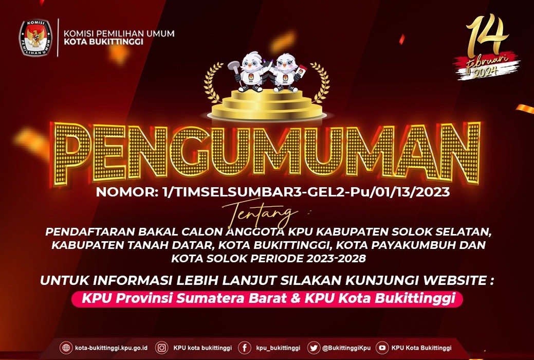 PENGUMUMAN NOMOR : 1/TIMSELSUMBAR3-GEL2-Pu/01/13/2023 TENTANG PENDAFTARN BAKAL CALON ANGGOTA KPU KABUPATEN SOLOK SELATAN, KABUPATEN TANAH DATAR, KOTA BUKITTINGGI, KOTA PAYAKUMBUH DAN KOTA SOLOK PERIODE 2023-2028