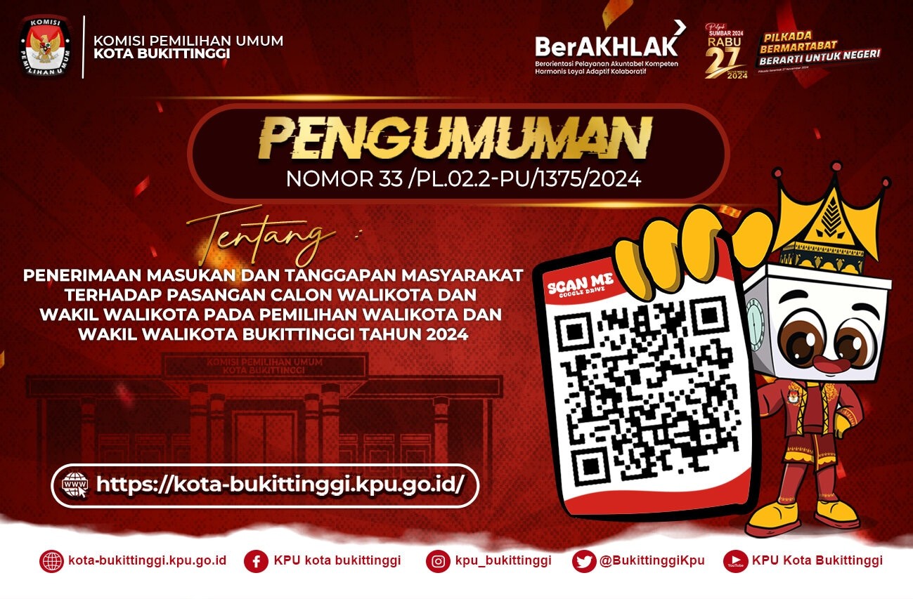 PENGUMUMAN PENERIMAAN MASUKAN DAN TANGGAPAN MASYARAKAT TERHADAP PASANGAN CALON WALIKOTA DAN WAKIL WALIKOTA PADA PEMILIHAN WALIKOTA DAN WAKIL WALIKOTA BUKITTINGGI TAHUN 2024