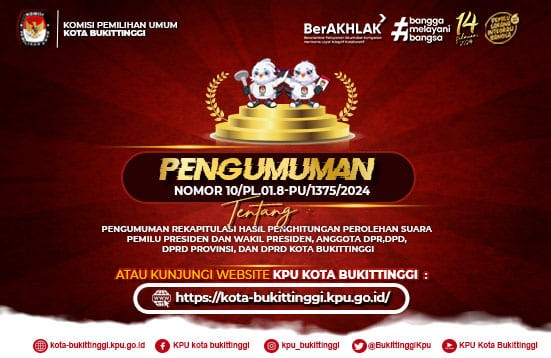 #TemanPemilih, yuk cek hasil perolehan suara pemilu Presiden, DPR, DPD, DPRD Provinsi dan DPRD Kota di Kota Bukittinggi Tahun 2024 dengan scan QR Code diatas atau melalui website KPU Kota Bukittinggi.