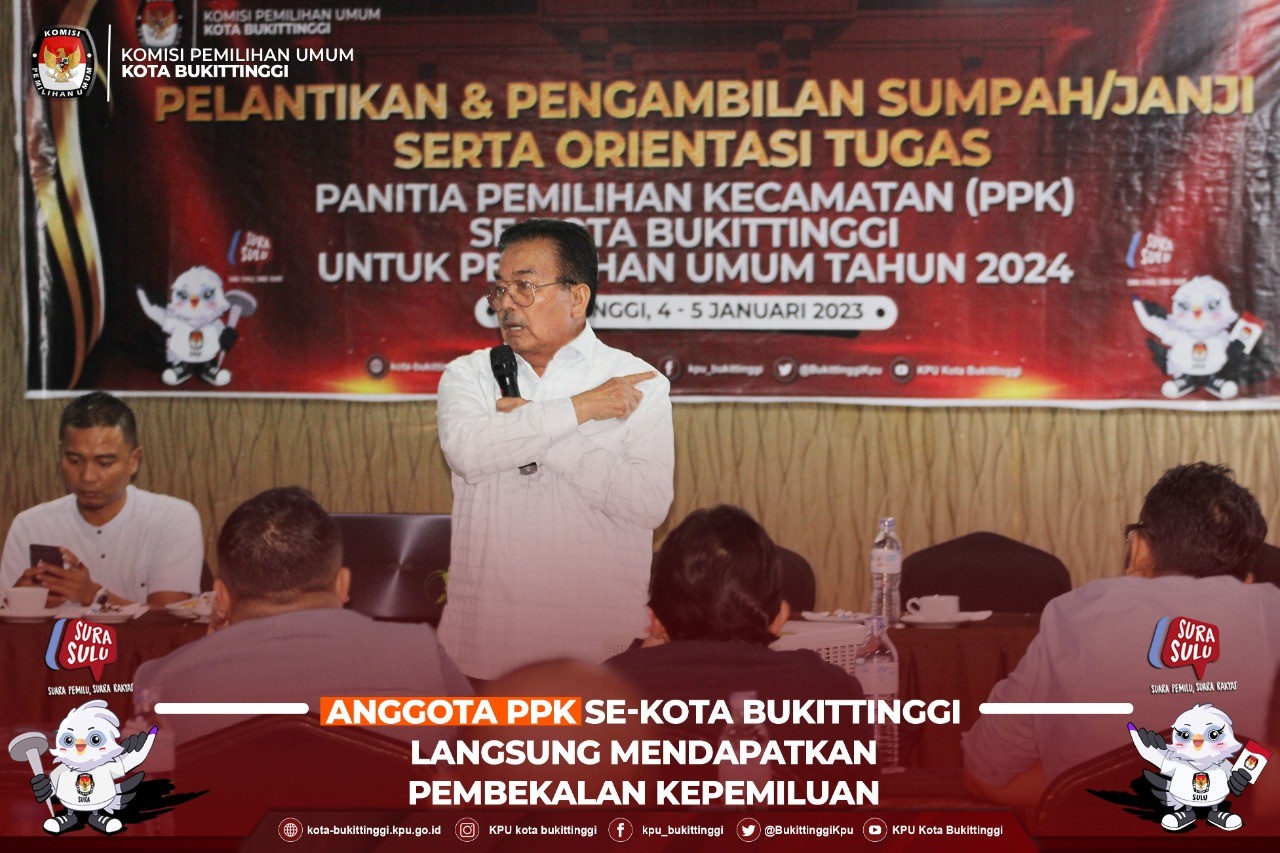 Bukittinggi, usai dilantik oleh Ketua KPU Kota Bukittinggi Rabu pagi (4/1), siangnya Anggota Panitia Pemilihan Kecamatan se-Kota Bukittinggi langsung mendapatkan Bimbingan teknis dan orientasi tugas oleh KPU Kota Bukittinggi yang berlangsung selama dua hari di Grand Rocky Hotel Bukittinggi
