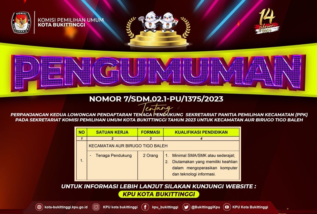 erdasarkan hasil seleksi wawancara Tenaga Pendukung Sekretariat Panitia Pemilihan Kecamatan (PPK) pada Sekretariat Komisi Pemilihan Umum Kota Bukittinggi Tahun 2023 yang dilaksanakan pada tanggal 3 April 2023, dengan ini diumumkan bahwa peserta sebagaimana tercantum pada Lampiran Pengumuman ini dinyatakan Lulus Seleksi Tenaga Pendukung Sekretariat Panitia Pemilihan Kecamatan (PPK) pada Sekretariat Komisi Pemilihan Umum Kota Bukittinggi, dan selanjutnya melakukan pendaftaran ulang kepada Panitia Seleksi di Komisi Pemilihan Umum Kota Bukittinggi paling lambat tanggal 6 April 2023 pukul 15.00 WIB dengan membawa seluruh dokumen ASLI sebagaimana Pengumuman Panitia Seleksi Nomor 5/SDM.02.1-Pu/1375/2023, Nomor 6/SDM.02.1-Pu/1375/2023, dan Nomor 7/SDM.02.1-Pu/1375/2023.