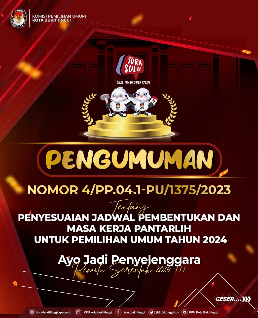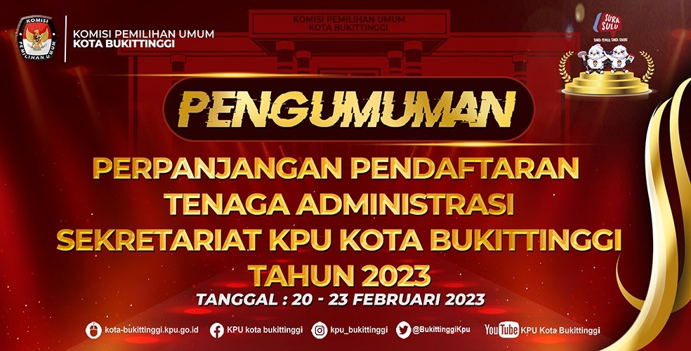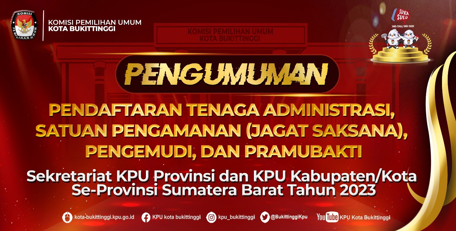 PENGUMUMAN NOMOR: 2 /SDM.02.1-Pu/13/2023 TENTANG PERPANJANGAN LOWONGAN PENDAFTARAN TENAGA ADMINISTRASI PADA SEKRETARIAT KOMISI PEMILIHAN UMUM KABUPATEN SOLOK, KABUPATEN PADANG PARIAMAN, KABUPATEN KEPULAUAN MENTAWAI, KOTA SOLOK, KOTA SAWAHLUNTO, KOTA PADANG PANJANG DAN KOTA BUKITTINGGI PROVINSI SUMATERA BARAT TAHUN 2023.