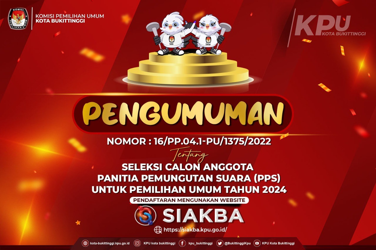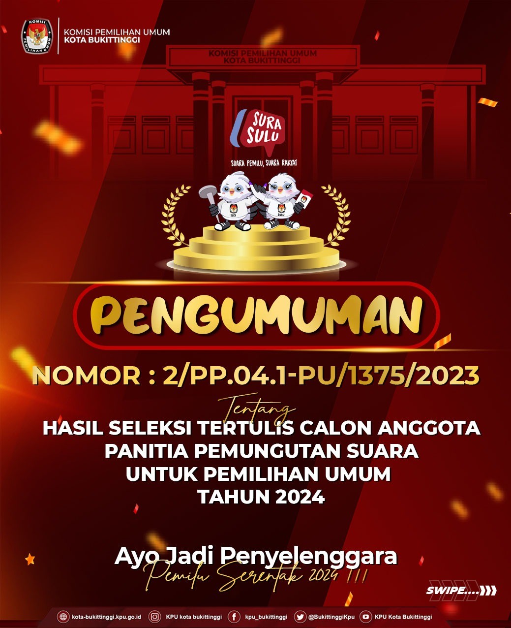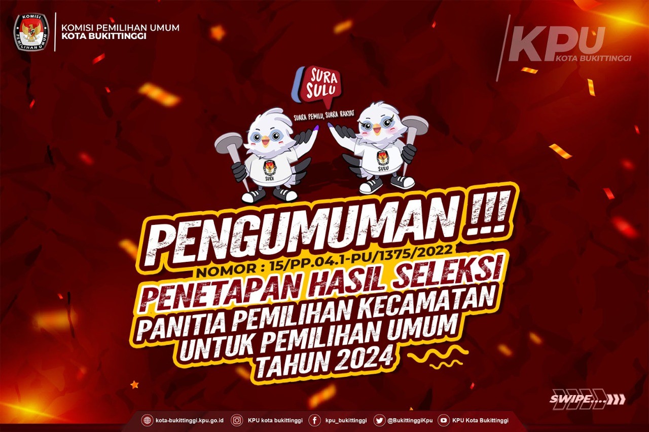 #TemanPemilih, Hari ini KPU Kota Bukittinggi mengumumkan hasil seleksi wawancara Panitia Pemilihan Kecamatan (PPK) untuk Pemilu Tahun 2024. Hasil seleksi wawancara ini ditetapkan melalui rapat pleno KPU Kora Bukittinggi sore tadi Rabu (14/12).