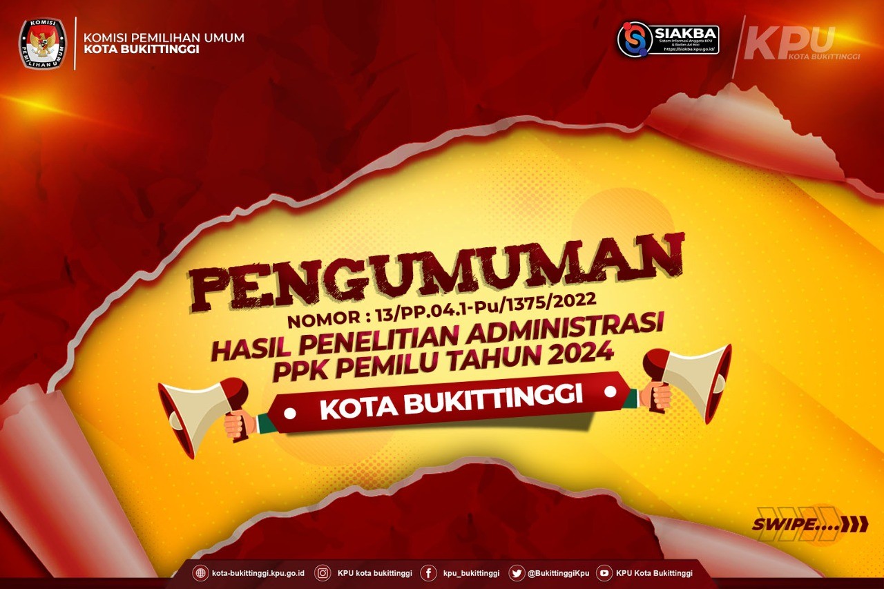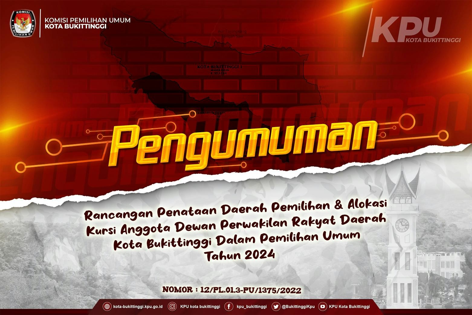 Berdasarkan pada Berita Acara Komisi Pemilihan Umum Kota Bukittinggi Nomor : 53/PL.01.3-BA/1375/2022 tentang Rancangan Penataan Daerah Pemilihan dan Alokasi Kursi Anggota Dewan Perwakilan Rakyat Daerah Kabupaten/Kota dalam Pemilihan Umum Tahun 2024, dengan ini mengumumkan Rancangan Penataan Daerah Pemilihan dan Alokasi Kursi Anggota Dewan Perwakilan Rakyat Daerah Kota Bukittinggi dalam Pemilihan Umum Tahun 2024 untuk dapat mendapatkan tanggapan dan masukan masyarakat sebagaimana tercantum dalam lampiran pengumuman ini. Klik link dibawah ini