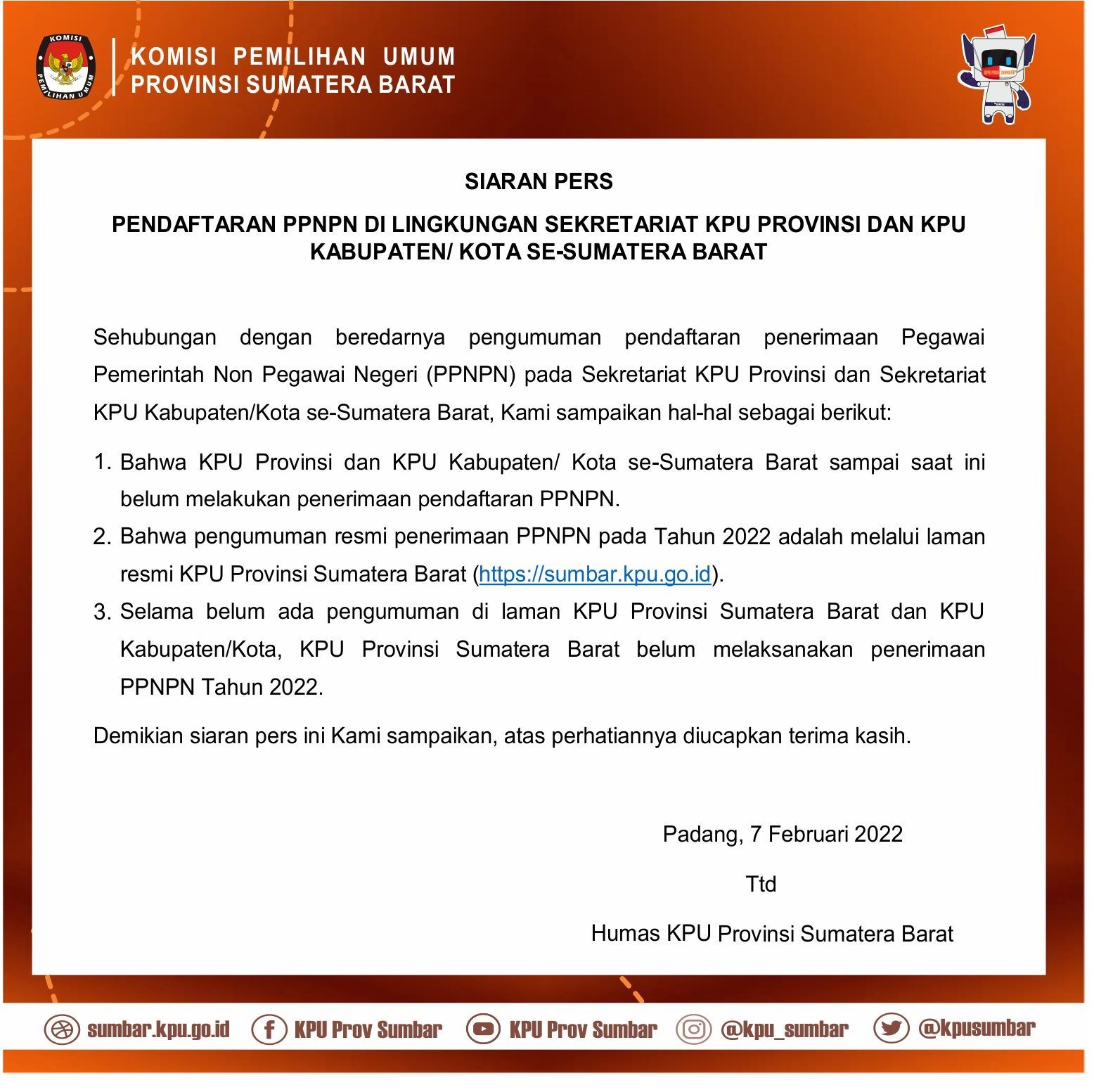 SIARAN PERS KPU Provinsi Sumatera Barat Senin, 07 Februari 2022 00:00 695 Berikut Siaran Pers dari KPU Provinsi Sumatera Barat Berkenaan dengan Penerimaan PPNPN Tahun 2022. repost from KPU PROVINSI SUMATERA BARAT Baca Selengkapnya