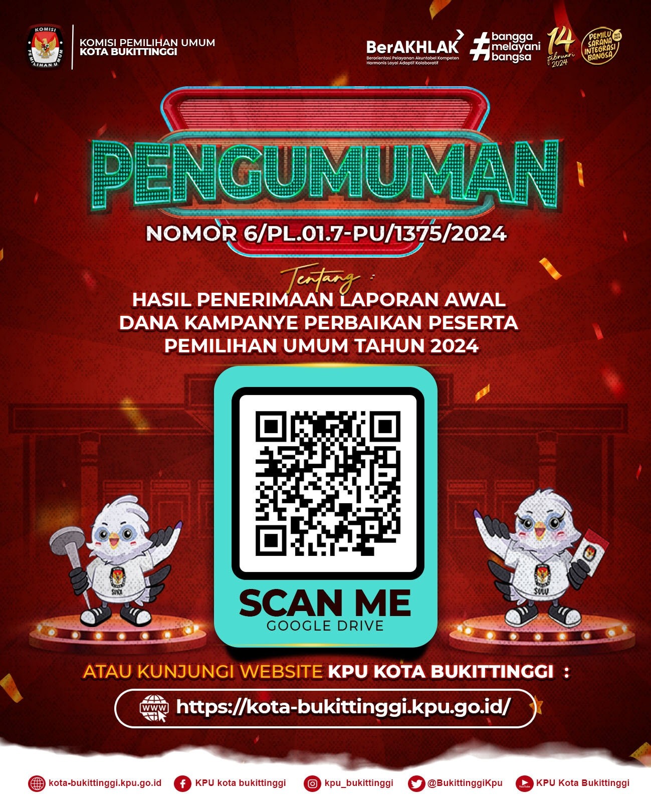 #TemanPemilih, yuk cek hasil perolehan suara pemilu Presiden, DPR, DPD, DPRD Provinsi dan DPRD Kota di Kota Bukittinggi Tahun 2024 dengan scan QR Code diatas atau melalui website KPU Kota Bukittinggi.